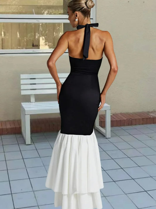 Siyah Beyaz Volanlı Asimetrik Kesim Elbise